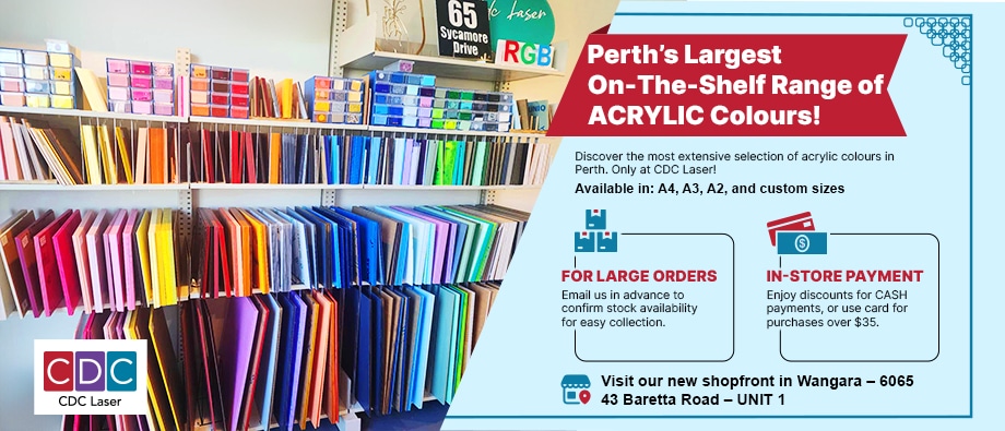 At CDC Laser we sell a huge array of acrylic sheets in Perth and custom-made projects like shop signage and custom stencils. Please note that our online selling page is just a portion of what we sell. We sell A4, A3, A1, and A2 sized sheets of every colour directly from our online and shopfront located in WANGARA Perth WA. So if there is something you require and you cannot see it on our page, don’t hesitate to call or email us and we can give you a custom quote for your specifications. To appreciate our range of colours it is best to come in-store or request a photo image of the colour in mind and we will email you directly to get the best idea of that specific colour.